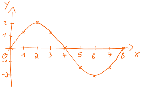 Zeichne mehrere Oszillatoren im Abstand von 1 cm zueinander, die eine harmonische Welle mit ŷ = 2 cm und λ = 8 cm darstellen.