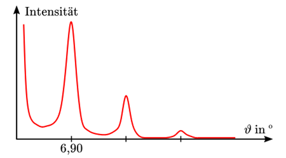 b) Das Spektrum erster Ordnung von RÖNTGEN-Strahlung an einem NaCl-Kristall mit dem Netzebenenabstand 282 pm ist unter einem Winkel von 6\(\frac{5}{6}\)° zu beobachten. Berechne die Wellenlänge der RÖNTGEN-Strahlung.