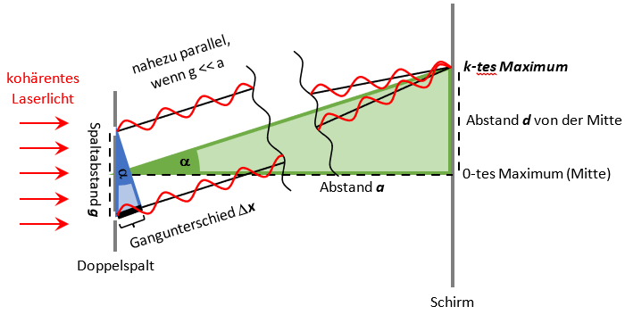 An beiden Spalten beugen sich Elementarwellen und interferieren dahinter. Sie sind aufgrund der gleichen Quelle kohärent, haben also die gleiche Wellenlänge und eine feste Phasenbeziehung zueinander. Hinterm Doppelspalt entstehen Bereiche mit maximaler Intensität (konstruktive Interferenz) und minimaler Intensität (destruktive Interferenz).