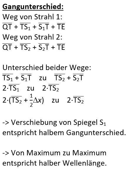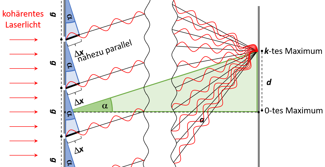 Es gelten die gleichen Formeln wie beim Doppelspalt. Die Vereinfachung für kleine Winkel gilt beim Gitter jedoch nicht, da die Winkel zu groß sind.