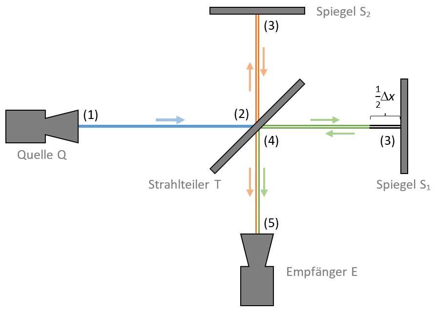 (1) Quelle schickt einen Strahl Richtung Strahlteiler.