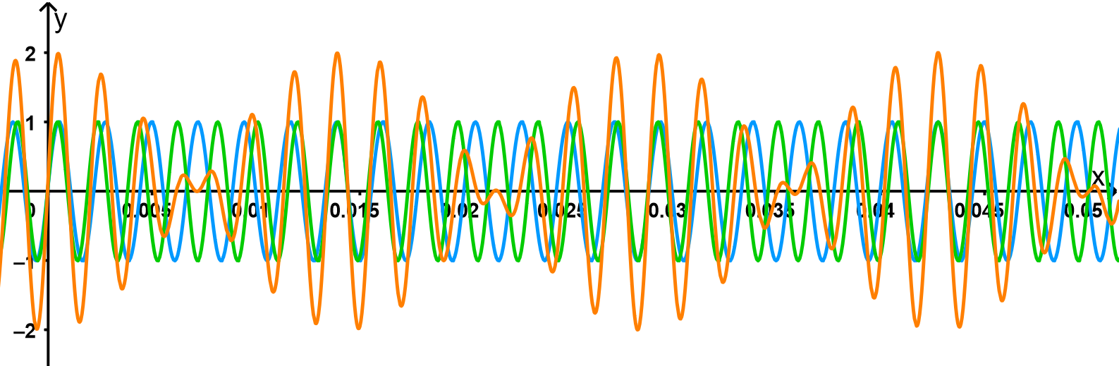- Die blaue Kurve entspricht zunächst 500 Hz und die grüne 520 Hz. Die gestrichelte orangene Kurve entspricht der Summe beider Kurven (die sogenannte „Resultierende“). Verändere die grüne Frequenz durch hin- und herschieben des Reglers. Beschreibe die Auswirkung auf die Resultierende sowie das Zustande-kommen ihrer Frequenz. Nutze dazu eine Skizze.