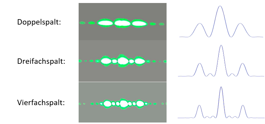 Im Vergleich zum Doppelspalt sind die Maxima des Interferenzmusters heller und schärfer abgegrenzt, da dort viele Wellen konstruktiv interferieren. In den Minima kommt es weiterhin zu einer völligen Auslöschung aufgrund destruktiver Interferenz. Zwischen diesen treten viele Nebenmaxima und -minima auf, da viele unterschiedlichse Phasen zusammentreffen.