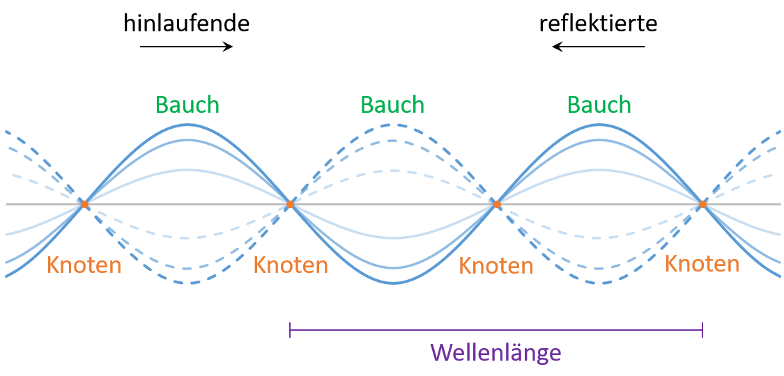 Überlagern sich die hinlaufende und die reflektierte Welle, so kann es zu einer stehenden Welle kommen. Sie ist durch ortsfeste Knoten (keine Schwingung) und Bäuche (maximale Schwingung) gekennzeichnet.