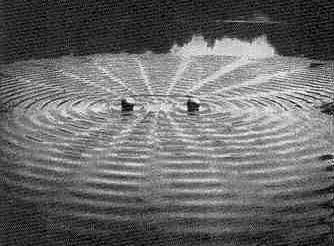 Im Bild ist die Überlagerung (Interferenz) zweier Wasserwellen zu sehen. Dabei entstehen Bereiche, in denen sich die Wellen gegenseitig aufheben (destruktive Interferenz) und Bereiche, in denen sie sich gegenseitig maximieren (konstruktive Interferenz).